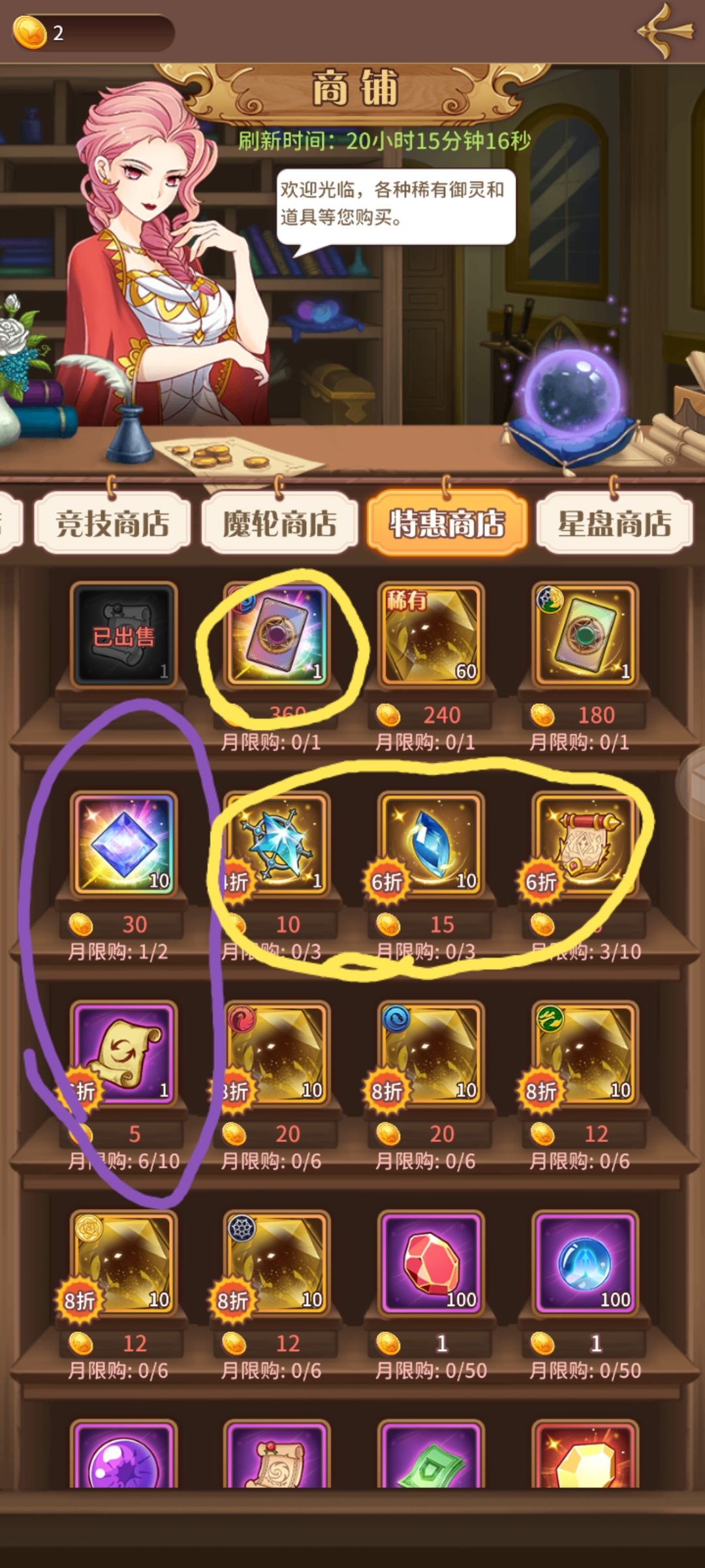 ①命运商店(神陨是很缺的材料,突破用的,挑战券不说了随意,6折那个女神之泪我不推荐,自己考虑吧。星空宝石必买。灵器水晶自己考虑)