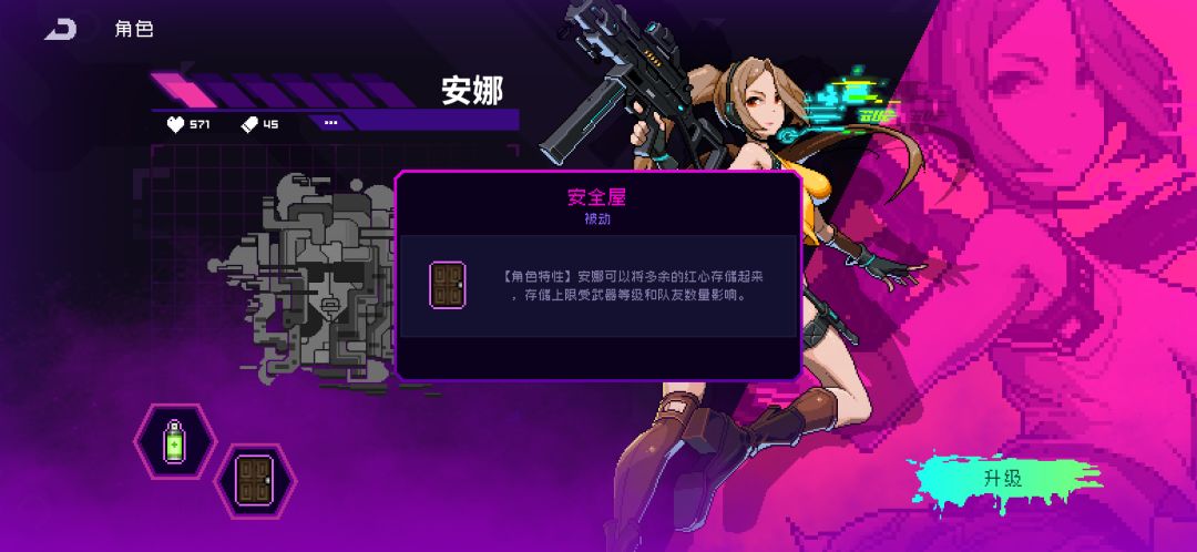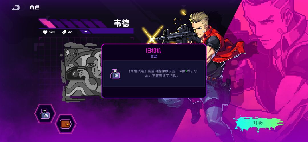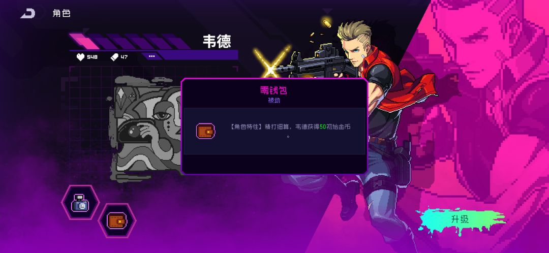 技能释放期间能够免疫弹幕,基本上能够规避霓虹深渊当中绝大部分的攻击,大大提高了自身的生存能力。能够让萌新更快的去上手游戏。同时韦德的被动零钱包更是能够让韦德在开局时就拥有一大笔启动资金,加快了发育速度。升满级之后的韦德更是能够获得更多的初始金币和更长的免疫时间,可以说是新手玩家的福音了。
