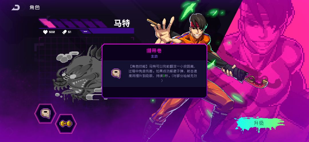 接下来登场的角色是马特了,作为一名杂技演员,他的血量还是比较厚的,同时生存能力也非常强,能够翻滚免疫伤害,同时还会提高自身的射速。