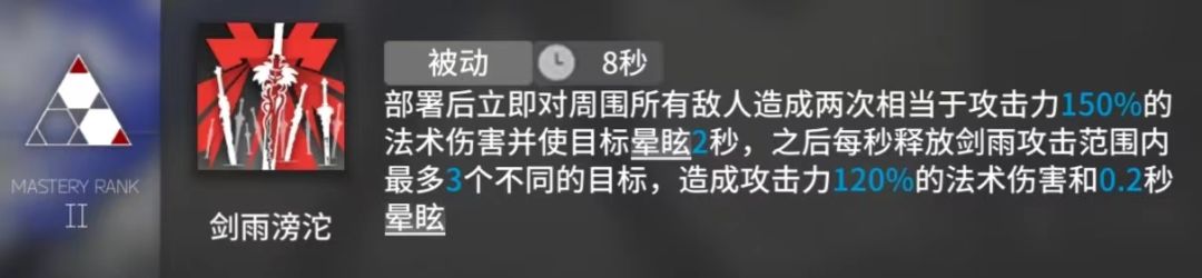 专三数据:部署后立即对周围所有敌人造成两次相当于攻击力165%的法术伤害并使目标晕眩2秒,之后每秒释放剑雨攻击范围内最多4个不同的目标,造成攻击力130%的法术伤害和0.2秒晕眩,持续时间8s