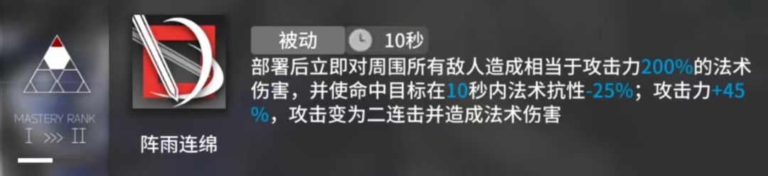 专三数据:部署后立即对周围所有敌人造成相当于攻击力240%的法术伤害,并使命中目标在10秒内法术抗性-30%;攻击力+55%,攻击变为二连击并造成法术伤害,持续10s