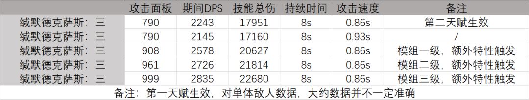 让所有技能(专三情况下)都能多打出一次伤害,五潜可以让一技能多打两次,减伤效果配合第一天赋的回血可以让缄默德克萨斯的生存得到一定保证,配合技能的法伤效果也可以直接单杀爆破攻坚手这样低抗高攻的敌人