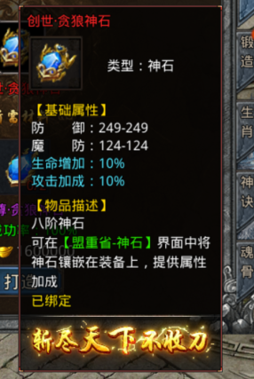 贪狼神石,能增加生命、攻击、防御与魔防属性。