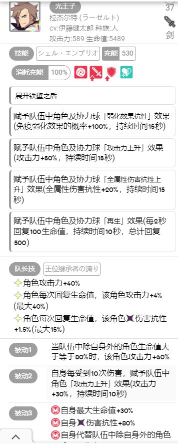 光王子,非常优秀的承伤手+buff手。他的被动3能够为其他位置的角色承担伤害同时他自己还能提高自己的生命值和抗性。此外,他的技能又提供了全队攻刃、回复以及抗性。因此在对抗暗属性的副本时如果存在生存压力,带上一个光王子准没错。