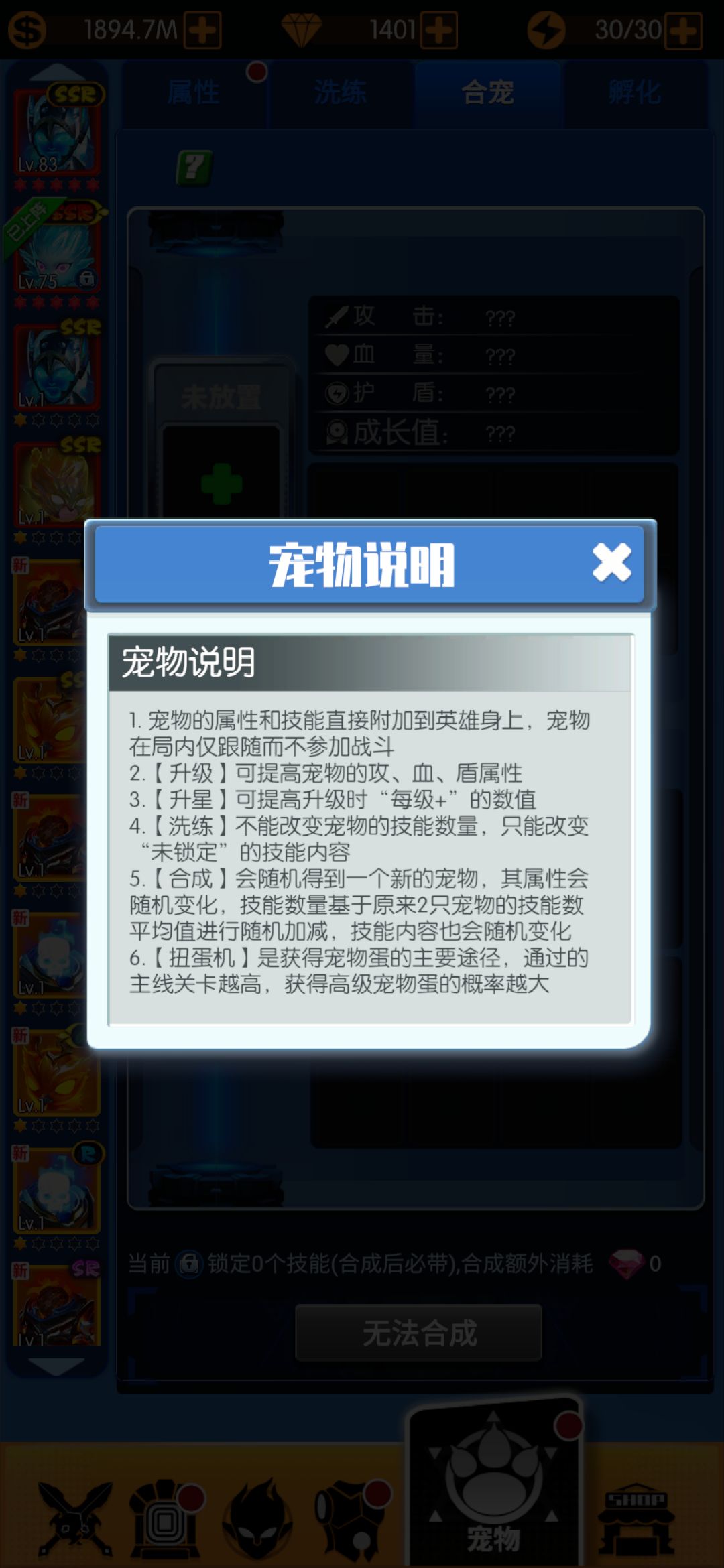 宠物合成规则为二合一,两个宠物技能数的平均值上下浮动2,比较考验欧皇属性