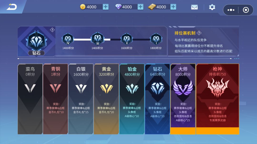 ●段位划分:新排位赛分为7个大段,分别是:菜鸟,青铜,白银,黄金,铂金,钻石,大师,枪神。其中除大师和枪神外的段位均有4个小段。大师和枪神没有小段,大师的全服排位分前1000名玩家为枪神。赛季结算时会根据玩家段位发放段位奖励,其中枪神的前100名更有豪华大奖!