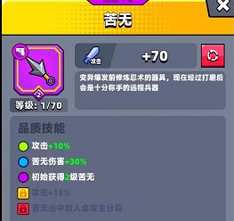 2、武器进阶:武器是能够进阶的,在游戏中同一把武器品阶越高,伤害和效果越好。,武器的品阶是有白色、绿色、蓝色、紫色、金色、3、三白合成一绿(同一种装备)三绿合成一蓝(同一种装备)三蓝合成一紫(同一种装备)紫合成紫1(需要任意紫)紫1合成紫2(需要任意紫1)紫2合成金1(需要紫2+紫2,例如:苦无紫2+苦无紫2=苦无金1)金1合成金2(需要任意金)金2合成金3(需要任意金)金3合成红1(需要两个金1,例如:苦无金3+苦无金1+苦无金1=苦无红1)二、装备篇
