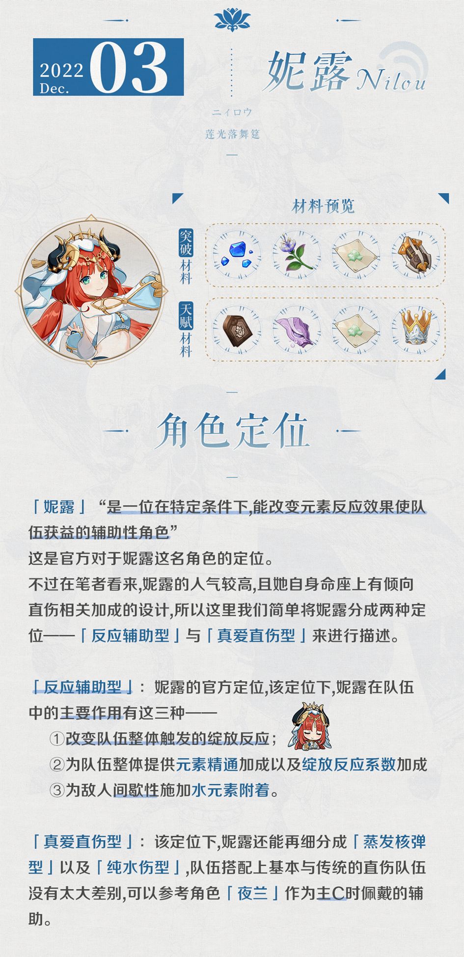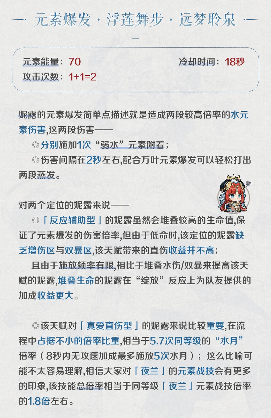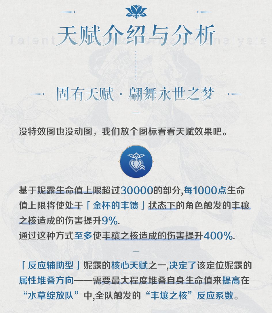 整体来看,官方更倾向于将妮露作为改变元素反应的首位角色推向大众,即「反应辅助型」,今天的内容也是主要围绕着该定位展开。