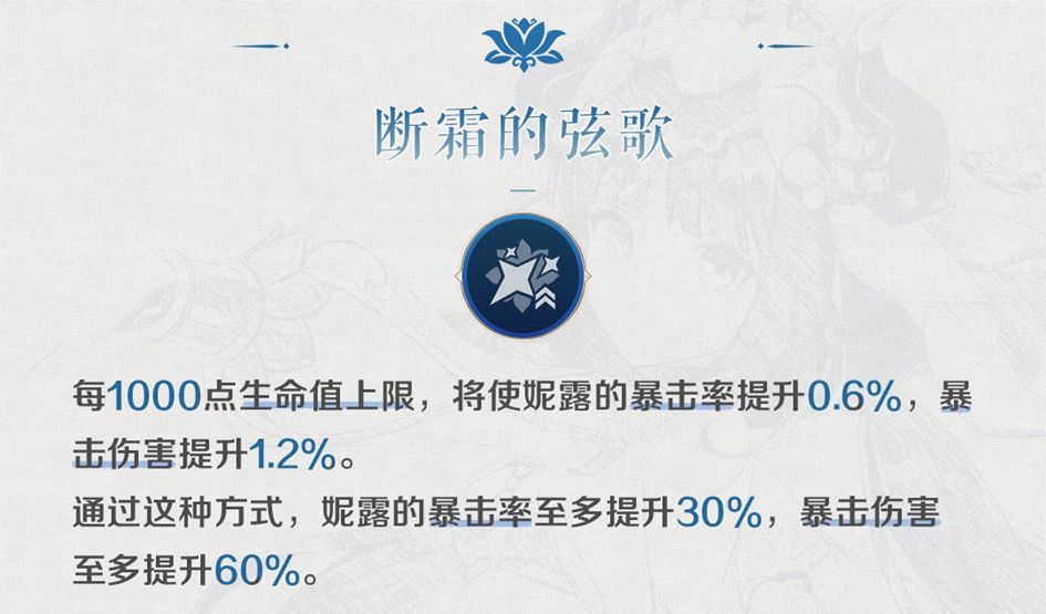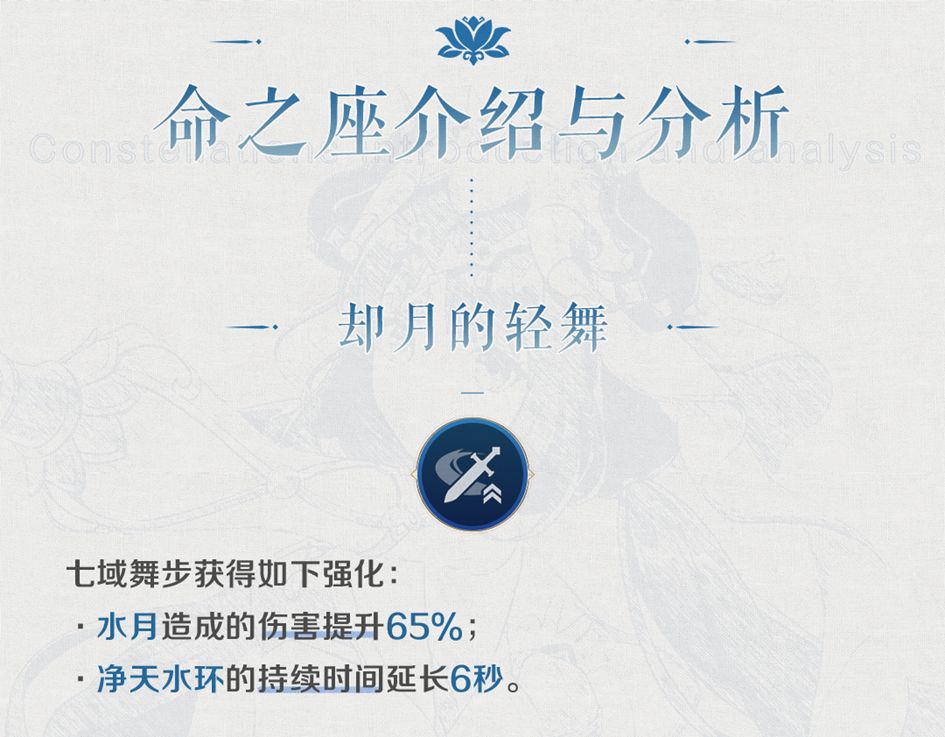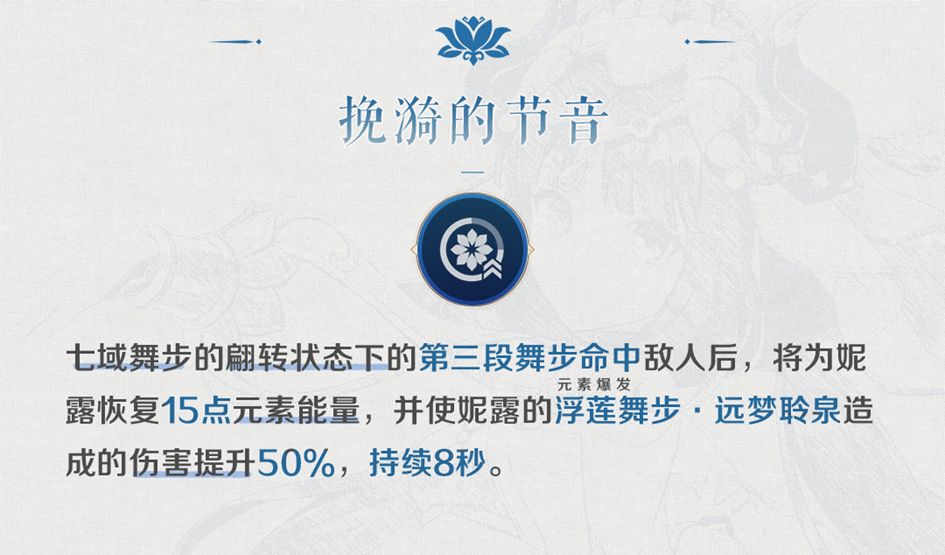 ◎对于「真爱直伤型」的妮露来说,该项加成看似较高,但由于只加成“剑舞步”中的“水月”部分,导致实际收益有限。在不同辅助的情况下,对直伤妮露自身的提升在7.6%~11.9%左右。净天水环的持续时间延长: