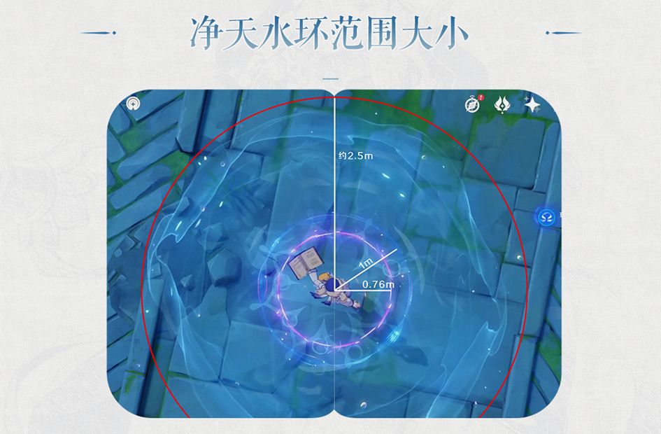 ◎看图示,可以发现,和半径1m的芭芭拉水环相比,妮露的净天水环半径约为2.5m;