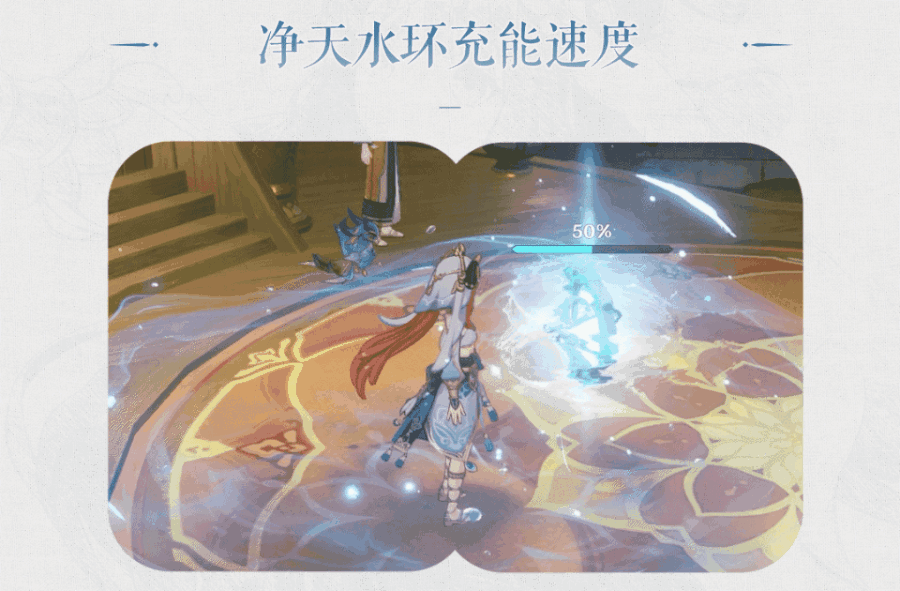 净天水环持续12秒,能够跟随自己队伍场上角色行动,持续为处于水环中的敌人施加水元素附着。