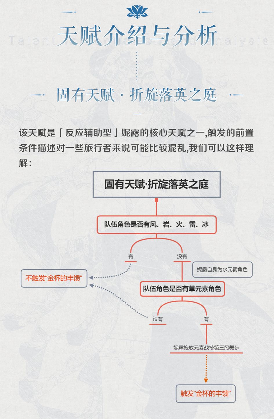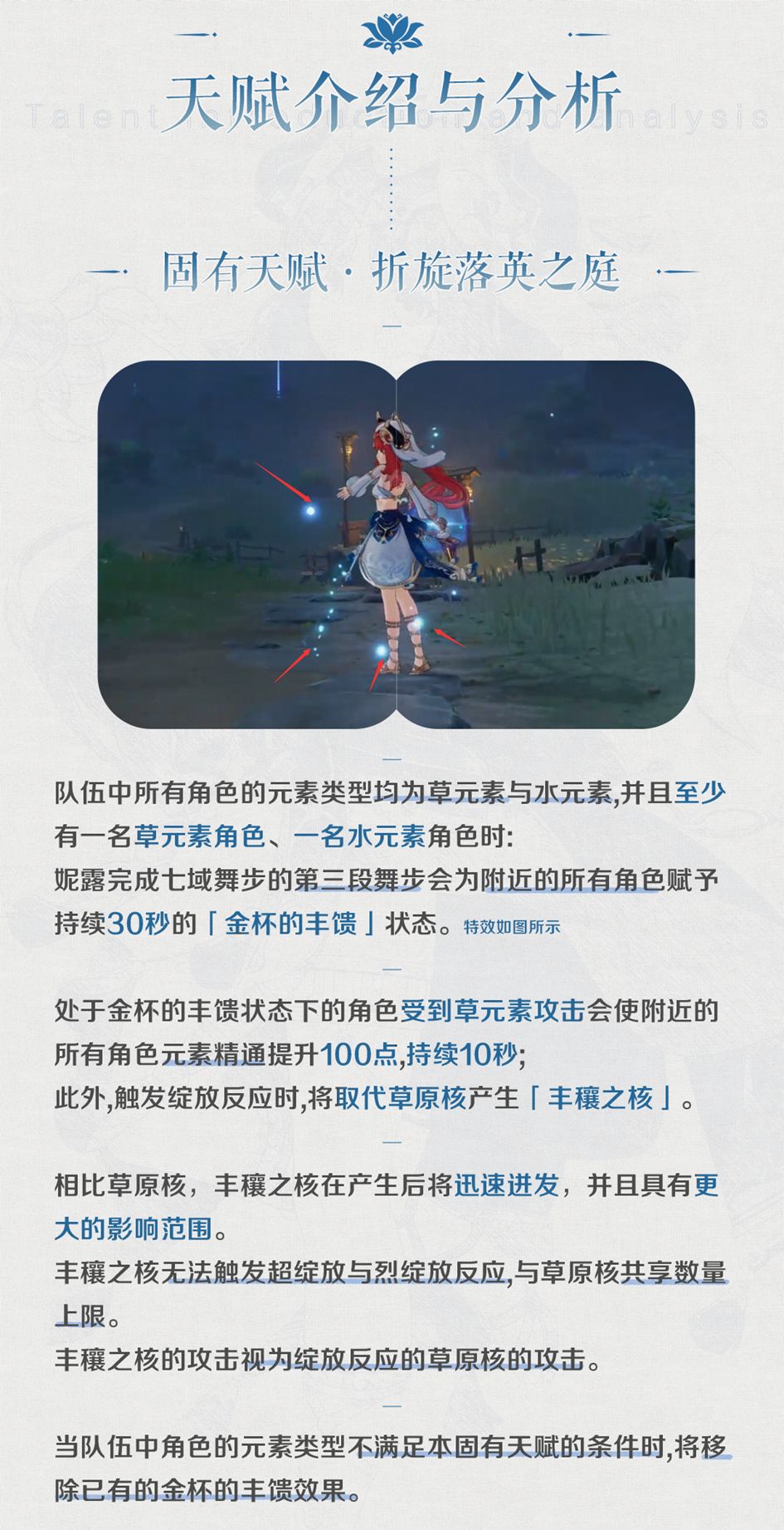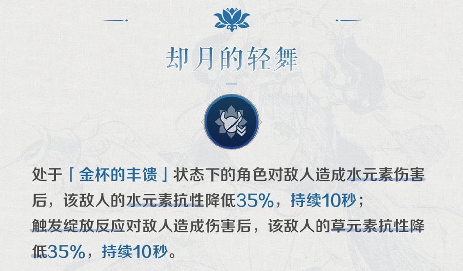 「反应辅助型」妮露的核心命座,目前游戏里唯三的草元素减抗手段之一(截止至V3.1版本),该命座主要提高的是妮露的辅助能力。但由于只能由「金杯的丰馈」状态下的角色触发,所以该天赋也只能在纯水草队伍中发挥作用,但胜在触发方式简单,基本可以保证效果常驻。