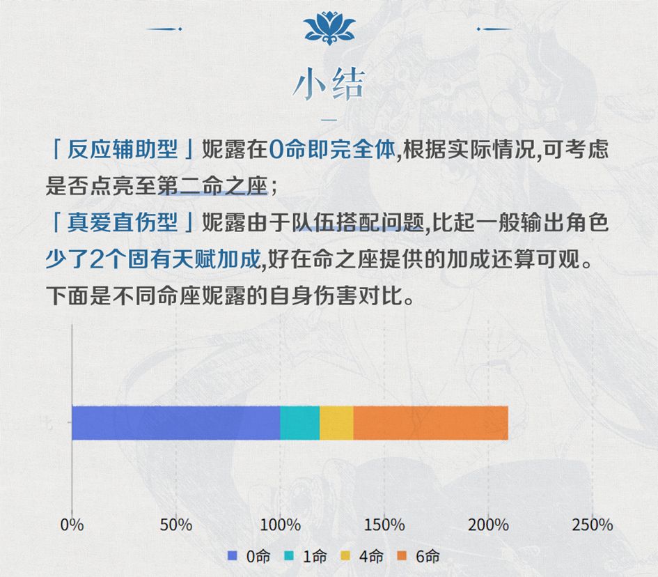 ◎在正常双暴配比下,该命座对任何定位妮露自身伤害的提升一般在50%~60%之间。