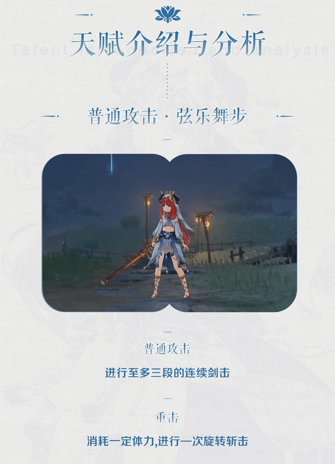 不过看V3.2前瞻,「莱伊拉」貌似也仅3段攻击,从中我们可以看出角色设计的资源分配更加合理,不用普通攻击的角色,就没必要在上面花费太多的资源hhh。事实也如我所说,无论何种定位的妮露基本都用不到普通攻击,此处也不再多提了。