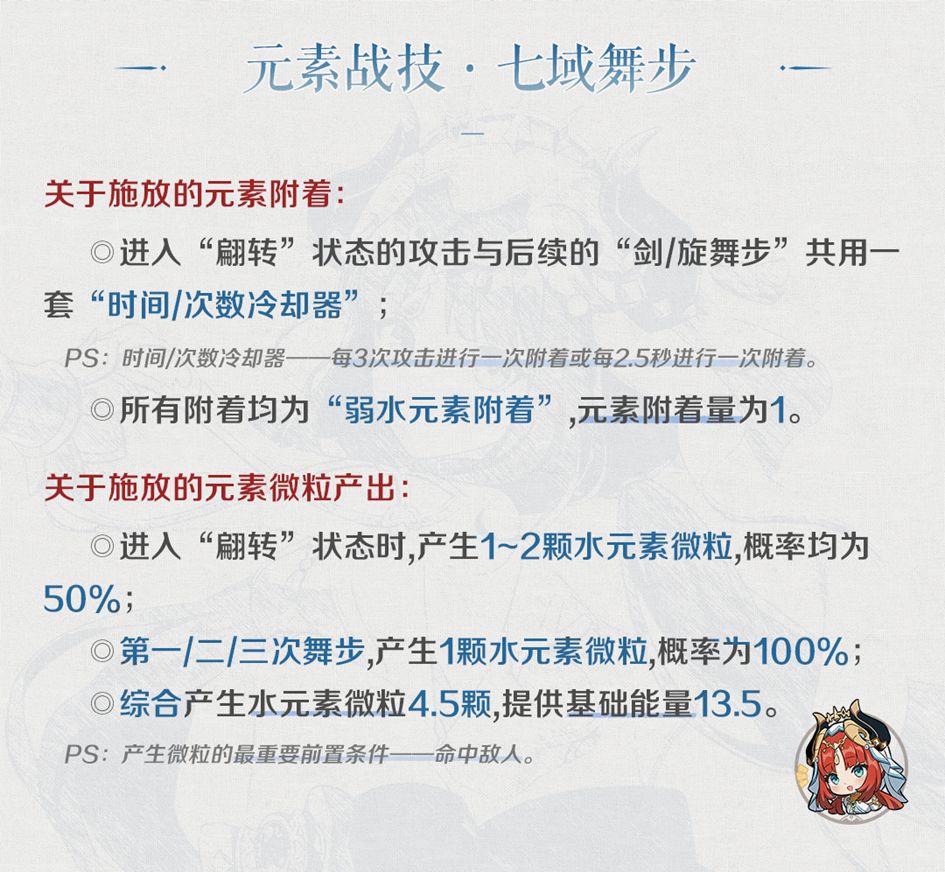 ◎与“翩转”状态下的所有伤害共用一套“时间/次数冷却器”,连续点击的情况下,一般3次攻击会进行1次“弱水”元素附着;