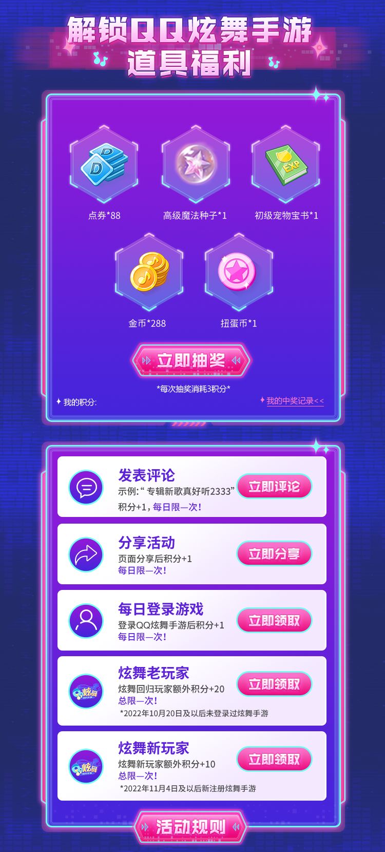 活动期间内收听三首歌曲即可参与1次抽奖(仅限1次) ,每日完成任务赢取抽奖积分,3积分可参与1次抽奖~抽奖有机会得点券*88、高级魔法种子*1、初级宠物宝书*1、金币*288、扭蛋币*1等好礼~