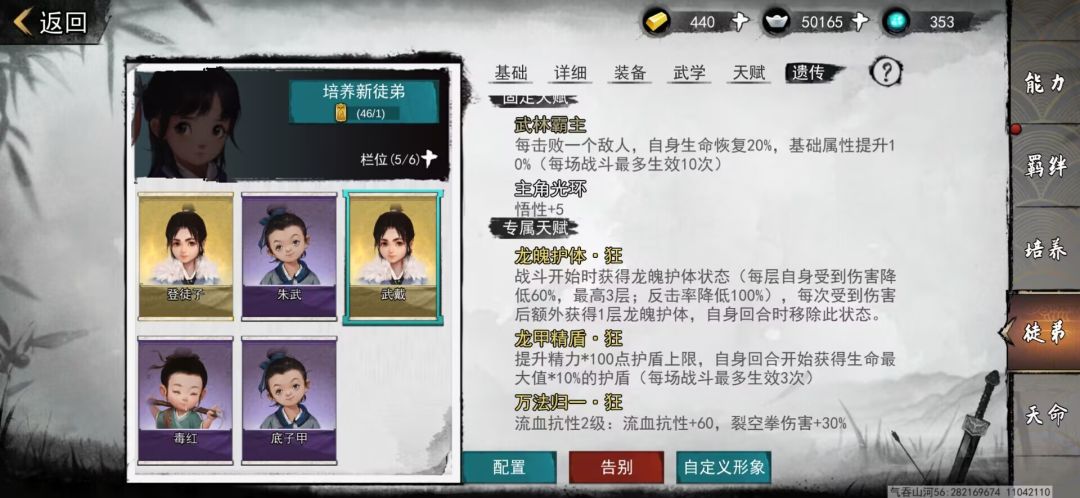 花费了60个收徒令,终于知道了收徒是怎么一回事!首先说一下收徒的机制,徒弟能够遗传师傅三个部分,分别是专属天赋,情缘天赋,还有就是专属技能!当然还有就是师傅的武学!现在划重点了!一个徒弟只能同时存在两个角色的专属天赋,两个角色的情缘天赋,还有就是两个角色的专属技能!