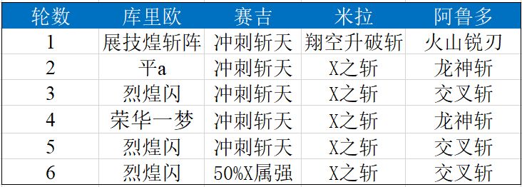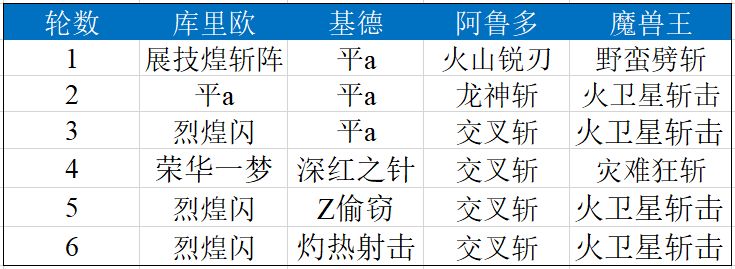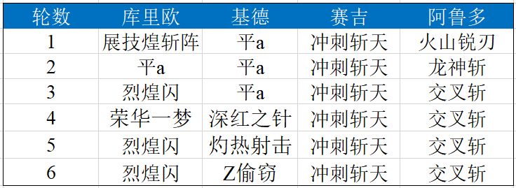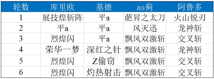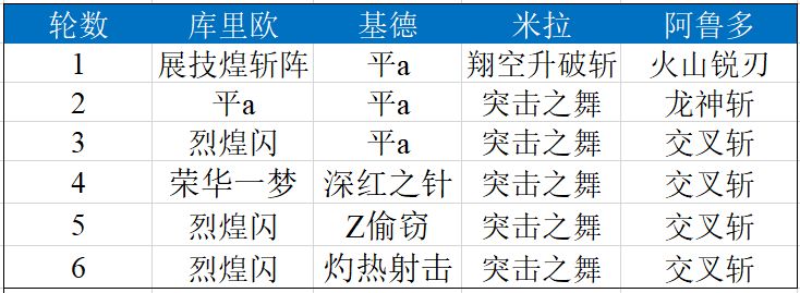 定式1.0是库里欧+基德+米拉+阿鲁多四人,他们的行动表如下: