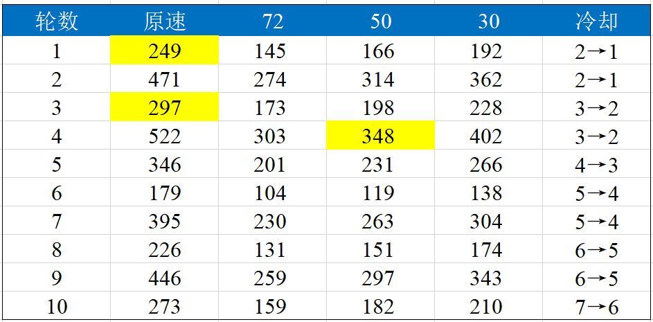 队员速度方面,我们需要重新喵一眼速度档位表,库里欧的加速作用发生在第三回合加速50%,前3回合看原速,后三回合看50%加速。从结论上讲,只要阿鲁多的速度超过249,其他人超过297,再怎么增加速度,从af档位上也不会再有优化,如果按不出来单纯是手速不够快。