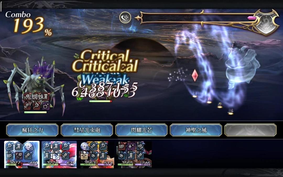 4星技能闪光,原作中也是大招之一,最大倍率为4.2(1.4+0.28×10)。第一个可以达成无视耐性+永续上痛的技能并且是先制攻击,因此出现了意料之外的bug,被我发现可以穿透免伤盾,并且一直都没修复。利用这个“机制”,首次完成冰狱鬼3T击杀。