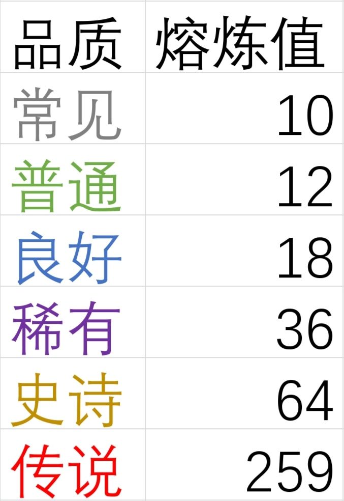 转换率为每点初始熔炼值能获取的打造经验值,右边为打造出不同品质装备的概率