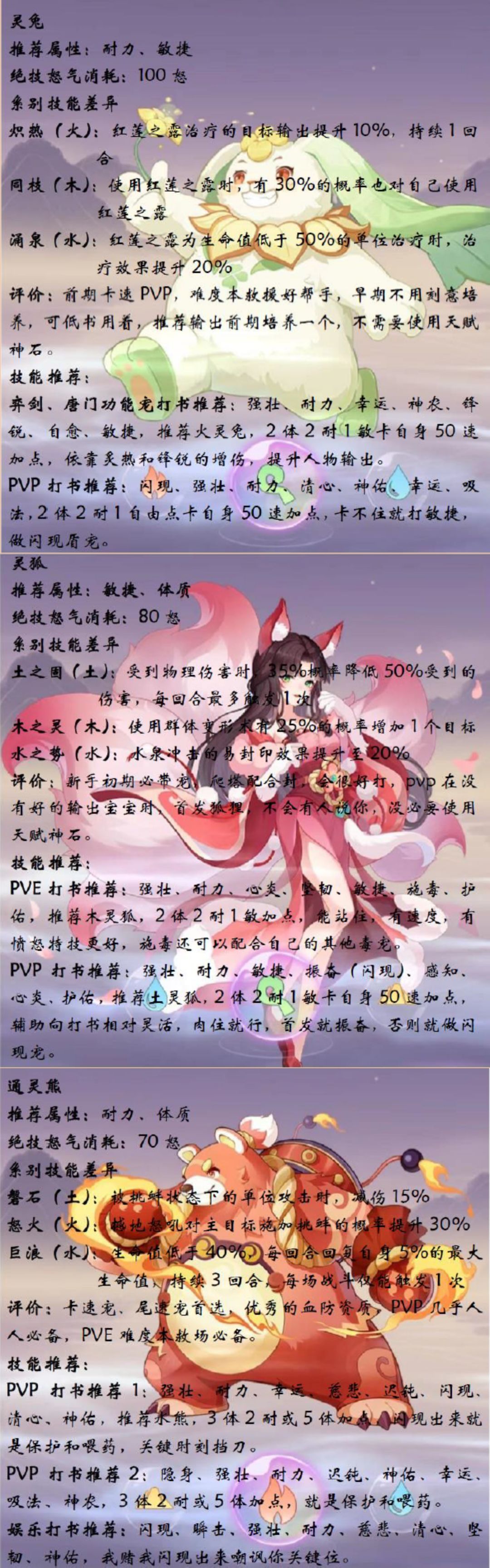 评价:新手非常实用的物攻宠,单体高爆发,前期推荐培养。火狗有强大的增伤能力,木狗在 pvp 端有不俗的表现,土狗可做耐攻,毒攻。