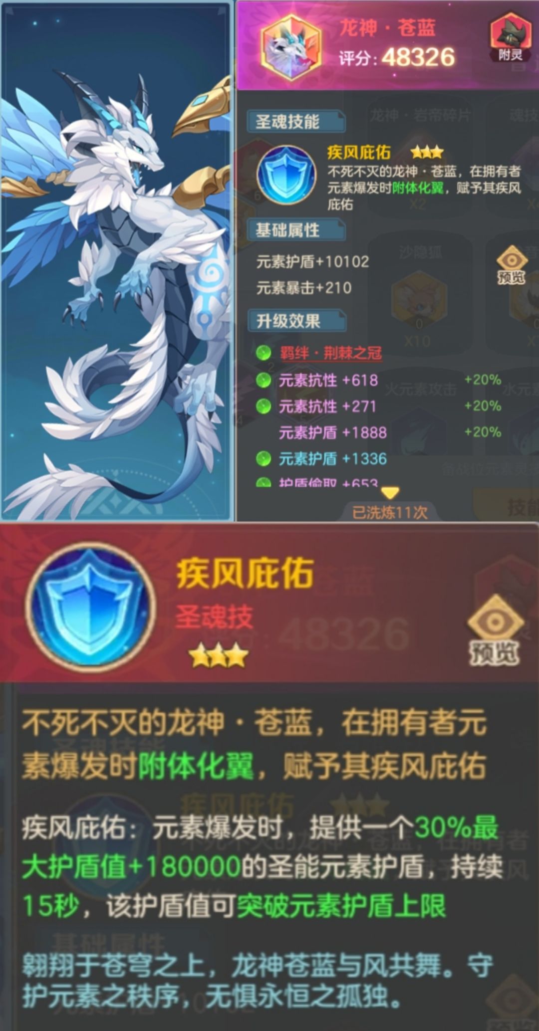 龙神苍蓝圣魂技–疾风庇佑作用是元素爆发时附体化翼,提供一个持续15秒的圣能元素护盾用来抵抗元素伤害,这就是龙神苍蓝圣魂技的初步运用,外在显像就是人物背后多了一对小翅膀。