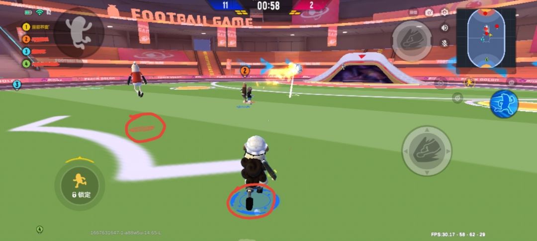 图中红色部分就是指引箭头,这个箭头在球场上都能发现,如果你是红方,那么你的指引箭头就会指向蓝方的球门,一定不要搞错哟~反之,如果你是蓝方,就会指向红方的球门![[嗒啦啦2_优秀]](https://img-tc.tapimg.com/market/images/bbb6da13ee1c31ee1405e261f12f366e.gif)