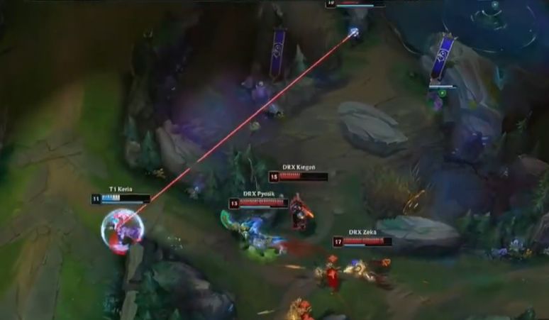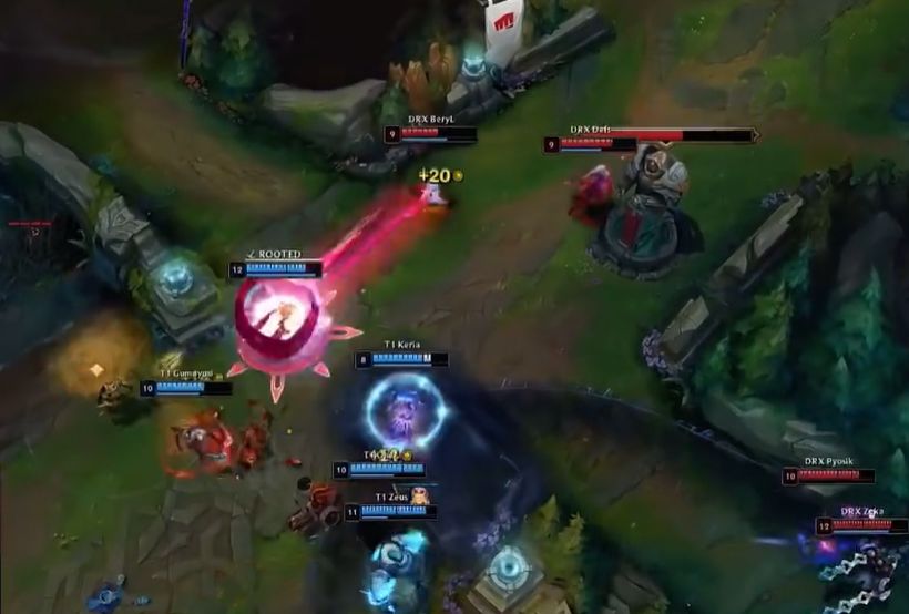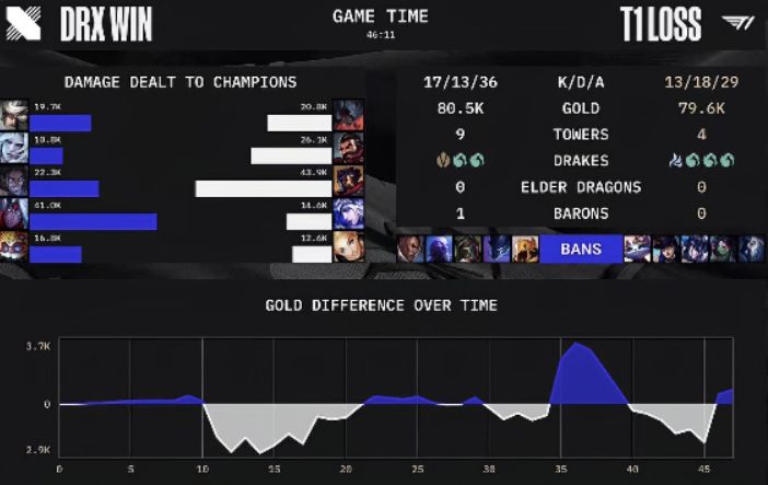 第四局,T1剑姬两次被越塔击杀,DRX拿到小龙。21分钟时,DRX Kingen剑魔河道一路追砍,25分钟时DRX拿到大龙,随后拿下本场赛点。截止到本场,DRX辅助BeryL已经在世界赛中拿到667助攻,成为世界第一。