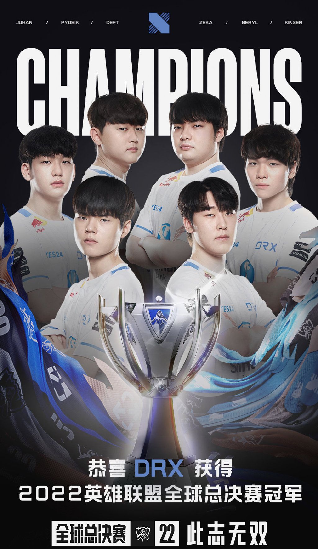 DRX 3:2 T1,恭喜DRX获得2022英雄联盟全球总决赛冠军