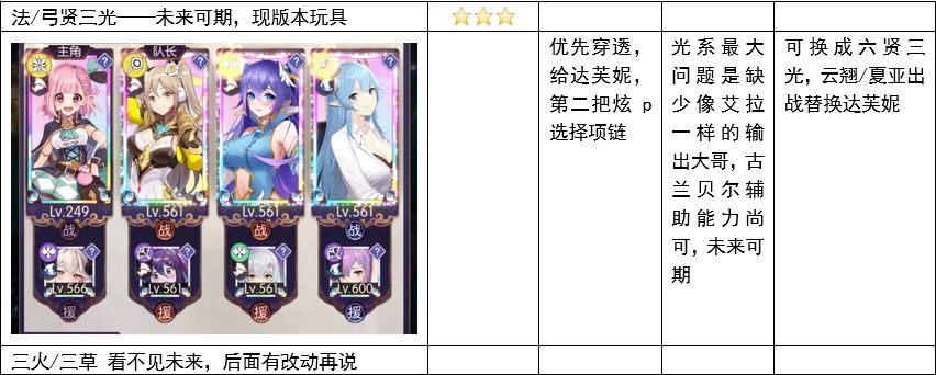 ③安妮炫p后可替换芙蕾雅,后期逐渐转换为331刺贤全恒金(莉莉无法被代替),此时安妮作为主输出,武具优先穿透,给安妮,其次给艾拉,之后给安妮项链