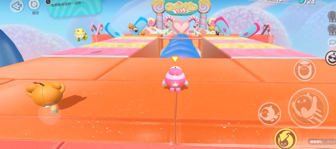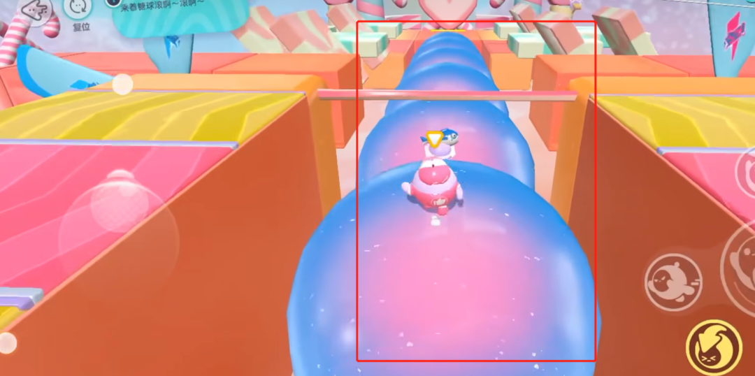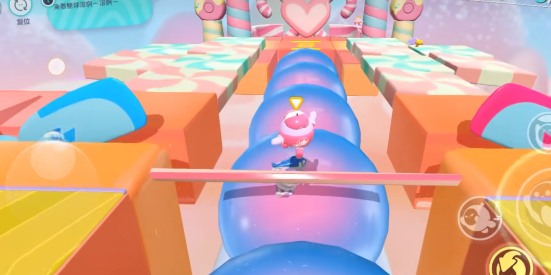 之前靓崽也说过,越是没有规则的赛制地图障碍越多。在<滚滚滚糖>中,全场最大的障碍就是占据了赛场主赛道的糖球们。