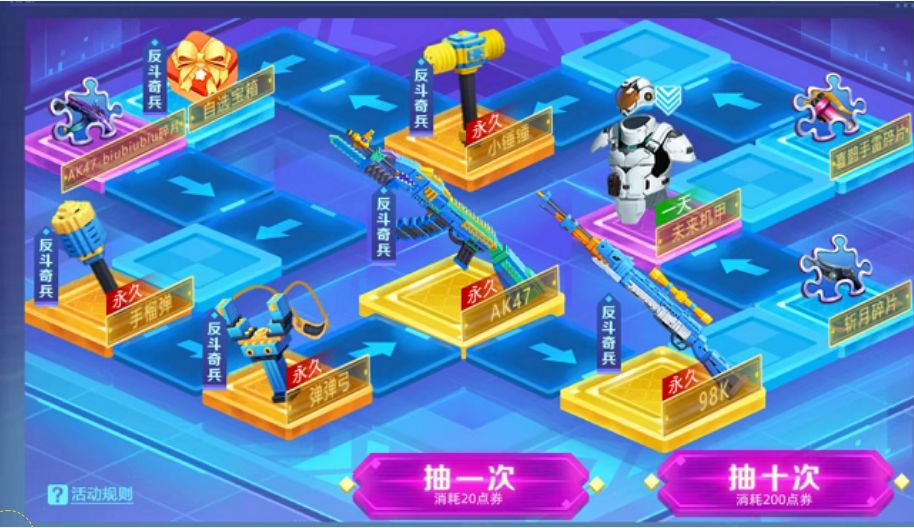 抽奖:花费20点卷可以购买一次抽奖机会,花费200点卷可以购买10次抽奖机会,每次抽奖都可以获得道具奖励。抽到反斗奇兵永久武器时,该武器将从奖池剔除,不会重复获得