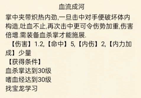 ★副流玩法:血杀掌/咏春拳+血影步+嗜血经血杀掌前期耗内大,中期乏力。咏春拳不好搭配血刀武学,耗内大。