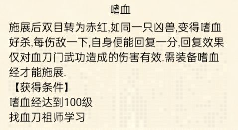 ⭐消耗内力:200,冷却时间:3回合。特殊效果:释放后,减少自身大约一半血量。(使用嗜血后,自身血量1/3时使用该技能,回血与减血相互抵消,不变化)