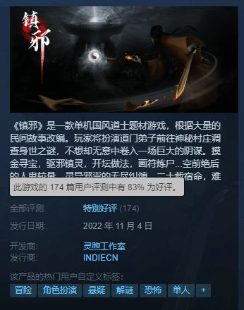 国风道士题材惊悚单机游戏《镇邪》于11月4日在Steam发售,首周特惠售价43.2元。截至发稿,本作获特别好评,好评率为83%(174)。