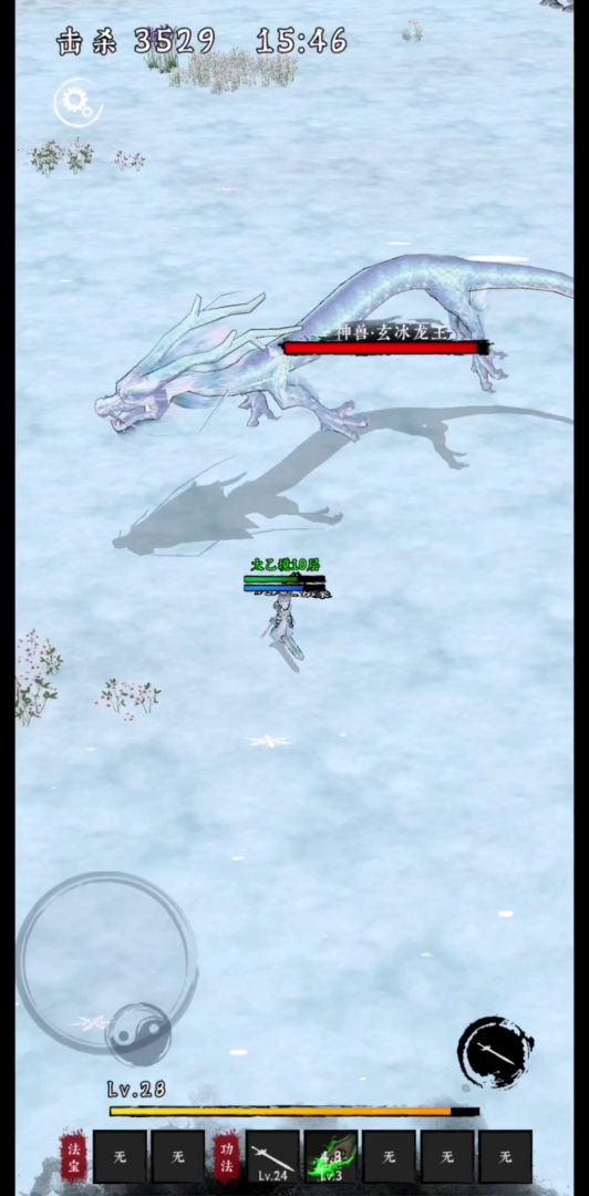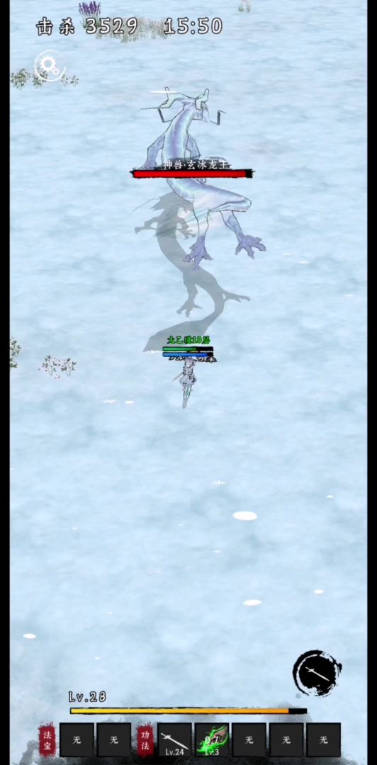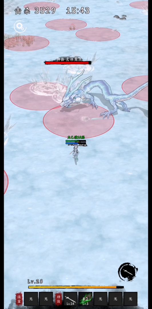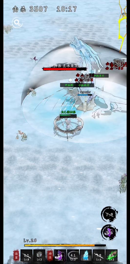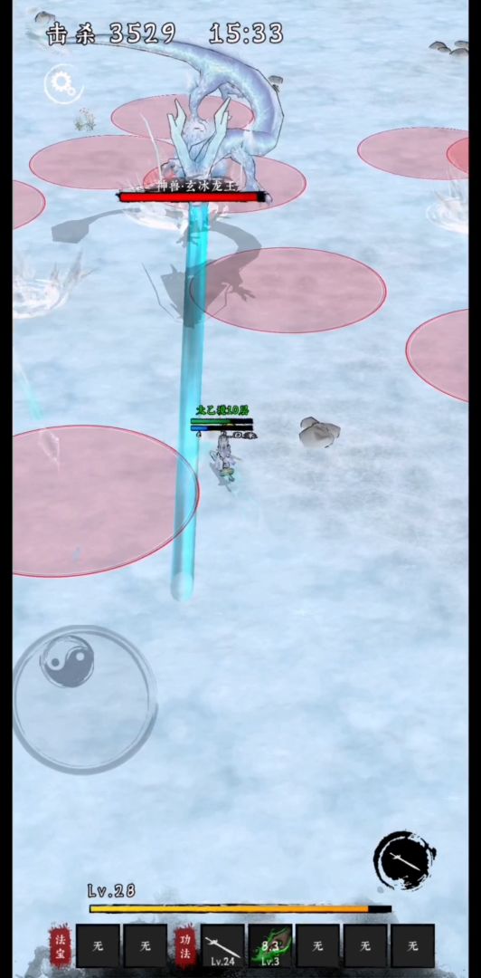 3、冰雹(玄冰决)。空中冰雹掉落到地面,造成小范围伤害,并冻结范围内的敌人。