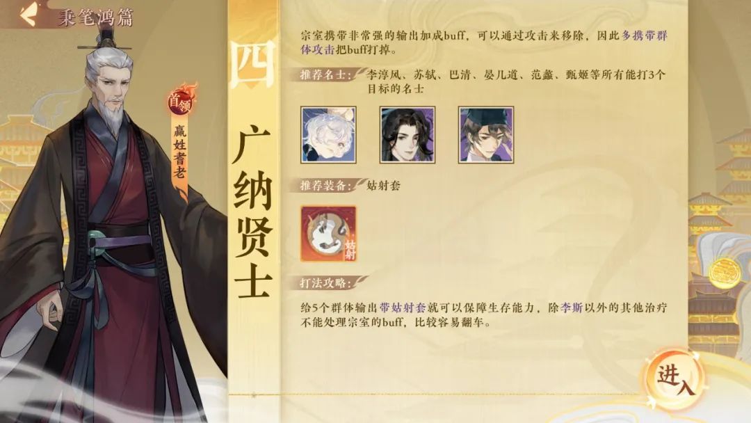 宗室携带非常强的输出加成buff,可以通过攻击来移除,因此多携带群体攻击把buff打掉。推荐名士:李淳风、苏轼、巴清、晏几道、范蠡、甄姬等所有能打3个目标的名士