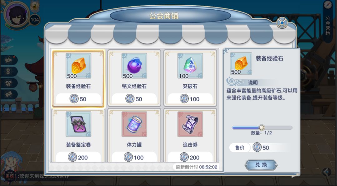 点击【公会兑换商店】设施,可以打开商店界面,消耗【贡献币】可以购买一些养成道具,如果有需要的话,可以多来看一看。
