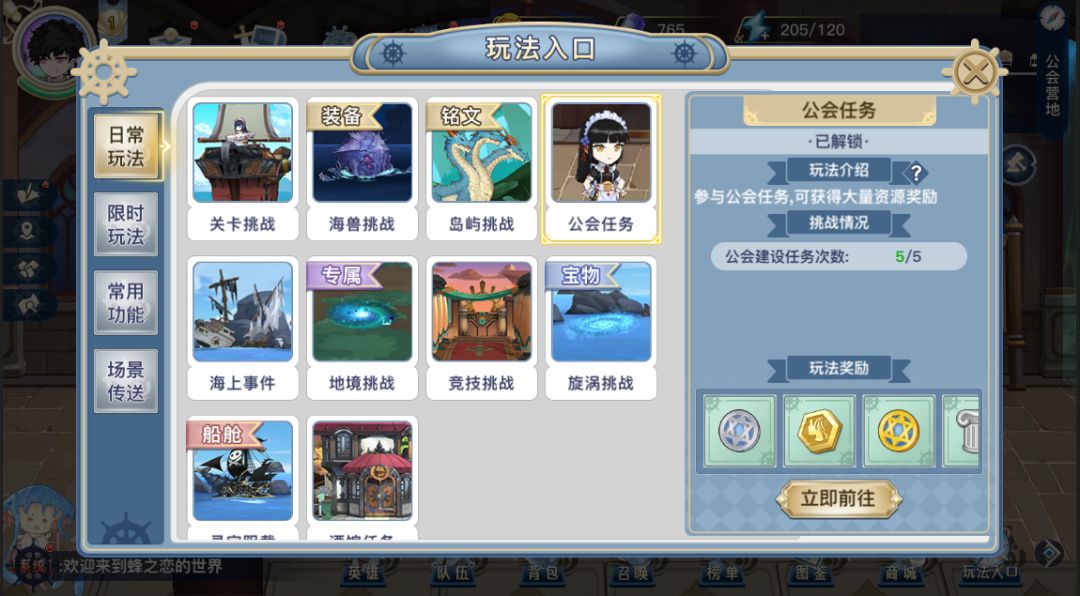 【玩法入口】界面中,点击【公会任务】按钮可以显示公会任务详情,系统每天05:00会重置公会建设任务次数,完成建设任务可以获得公会奖励和公会贡献度。