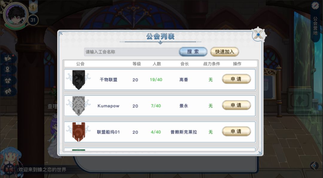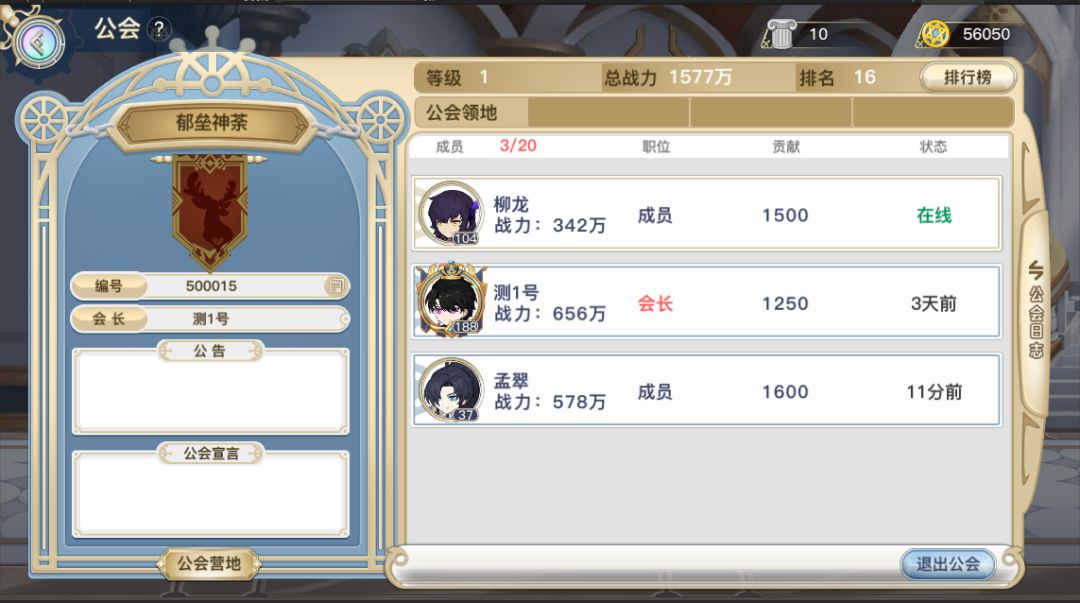 游戏内主角加入或创建公会后,点击主角面的人物立绘,会开启公会管理界面,在公会管理界面中,可以查看其余公会小伙伴的详细信息,和进行人员管理。