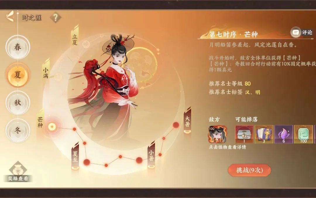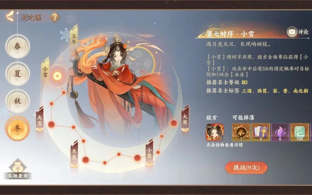 1. 时之涯主要是对于玩家练度的考验,可以通过换装备/九世灵进行提升战斗力。