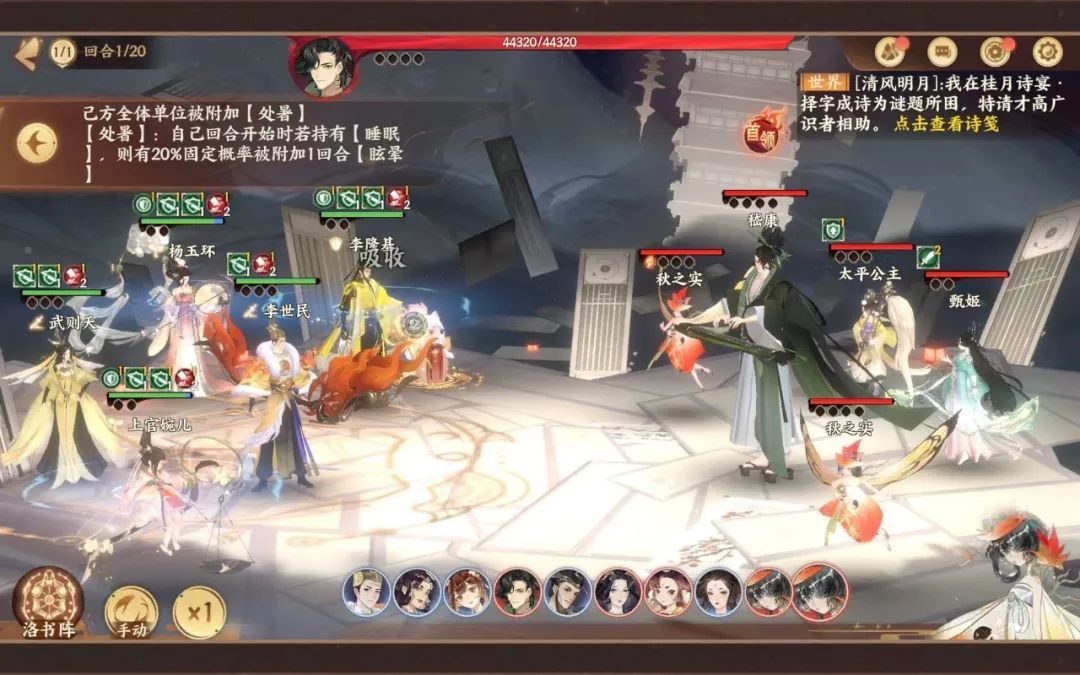 秋之实的特性是流血,在释放觉醒技能时输出较高,可以考虑带上一个杜甫用技能的黄鹂来免疫部分控制/减益效果,装备上也可以考虑捭阖套和长振套来削弱流血带来的影响,同时优先集火小精灵也是一个不错的选择。可以试一下灼华太平公主和流光李隆基双控阵容,利用高频率的控制效果进行击杀,甚至还可以打火李隆基。