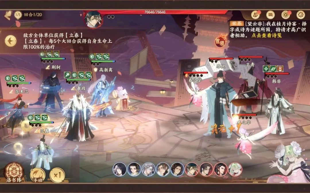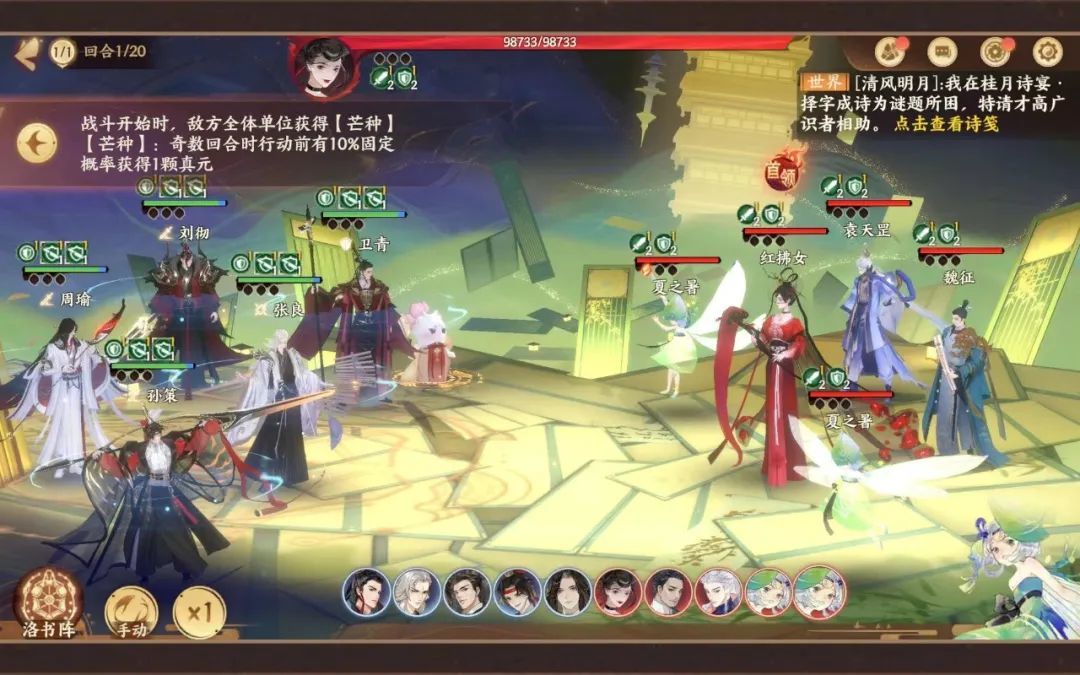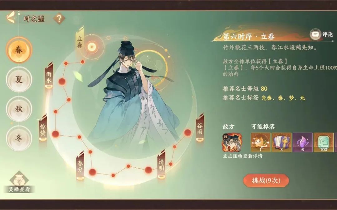 主要怪物为春之华,特性是回血,针对这个问题可以考虑带一套茂和套或者上莫邪(技能可以附带减疗效果),桃源居效果带上固定概率不消耗真元以及百分之五概率眩晕的buff,可以通过触发眩晕/减疗使得春之华回血减少,再利用范蠡的易伤或者屈原的增伤爆发进行击杀。这里值得注意的是,春遇见雷螭的时候不要带银琰或者灼华套,额外加火会被控制哦。