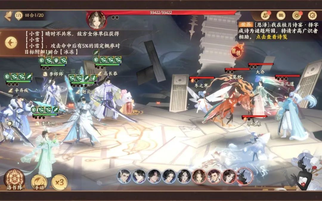 冬当前版本天卡比较多,使君可以参考自身阵容中已有的比较强的天卡作为输出。冬的特性是冬之寒的冰冻效果,应对上可以考虑带上一个李师师和李清照。通过李师师的大招以及李清照的青梅应对冰冻效果,同时桃园的buff上可以考虑行动开始前驱散自己的debuff。在满足以上情况下,可以考虑优先集火敌方的输出名士,因为冬之寒自身的攻击力并不高。同时,佛印在冬得发挥也是不容小觑的哦!