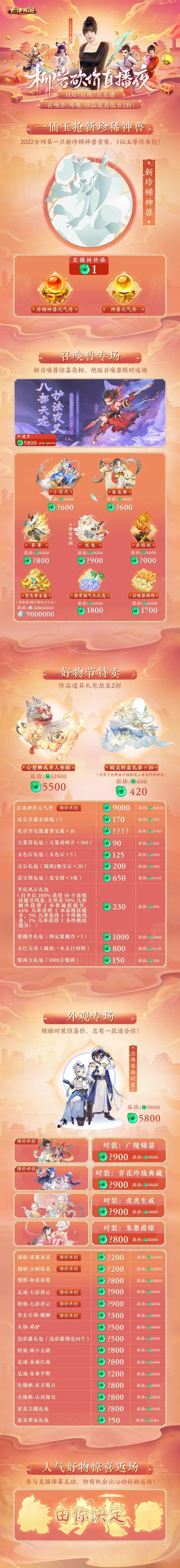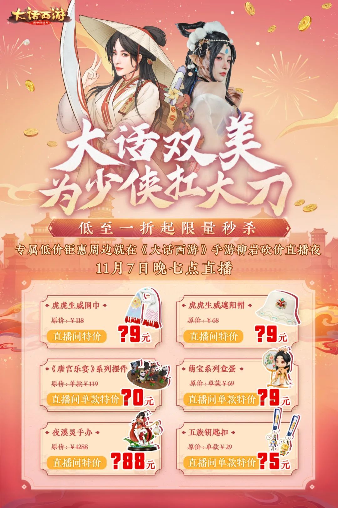 事关砍价,当然也少不了杀价掌柜-狐美人的身影。听说这次直播也有一些大话周边好物,在狐掌柜与砍价官柳岩双刀合璧下,降到前所未有的超值价格!更有超萌新品周边,开启直播秒杀。数量不多,兄弟们可要蹲好了!