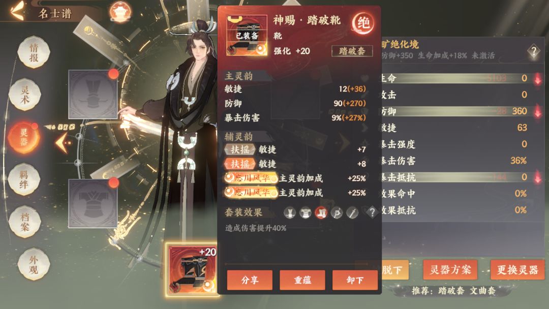 假如需要给控制名士洗一套灼华,那么饰这个位置的风华提供的生命、暴击强度、攻击力的三个主灵韵效果对于控制名师的影响并不大,正确的属性是洗效果命中。如果是治疗性名士,即可考虑防御加成等。