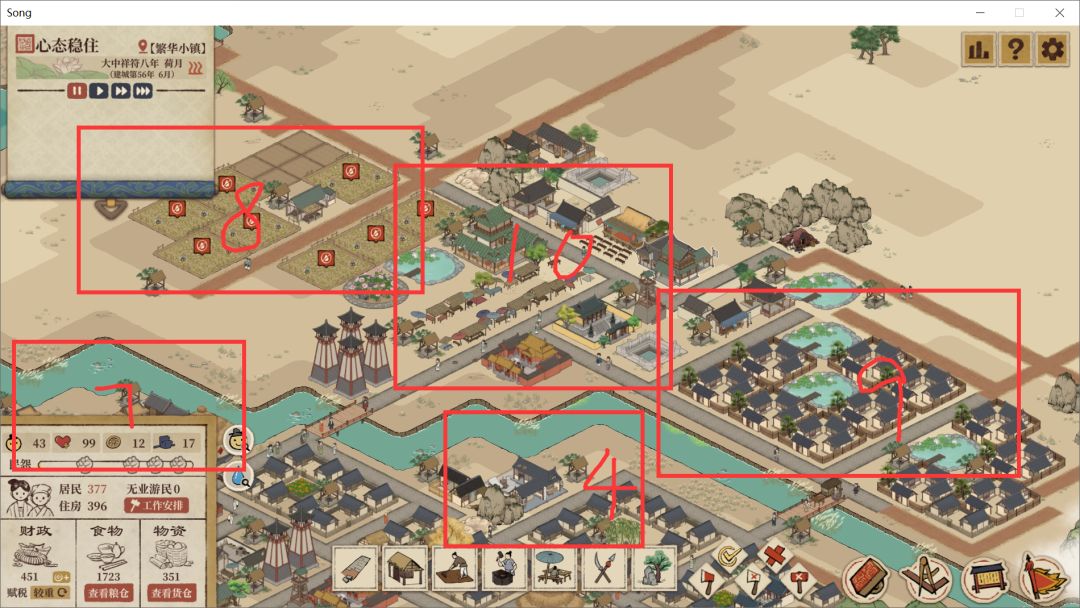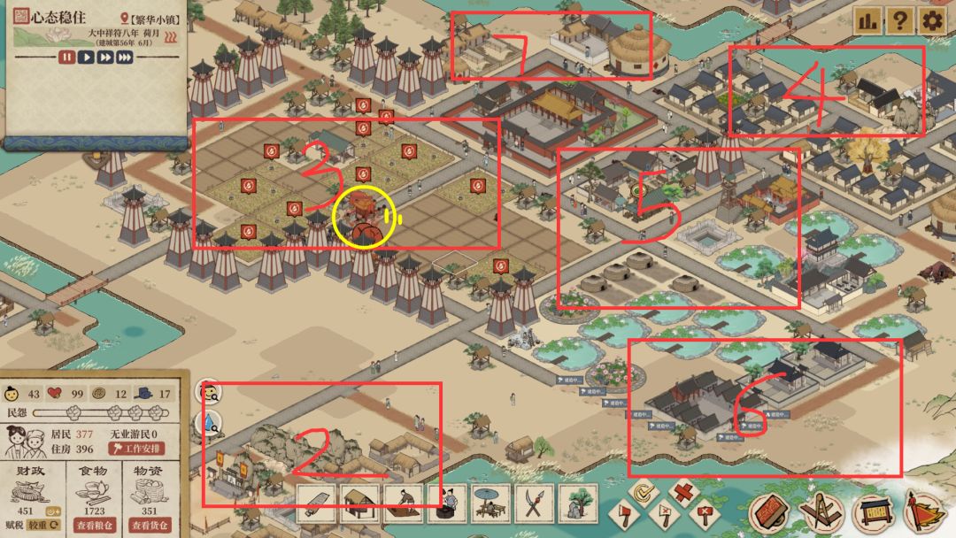 黄色圈是圣驾+弓兵厢兵+刺客,3是农业区,4是老居民区(茅屋农舍),5是脚店区(4炭1民窑1脚店1铁匠1佛寺),6是义庄和牢狱,7是存储区