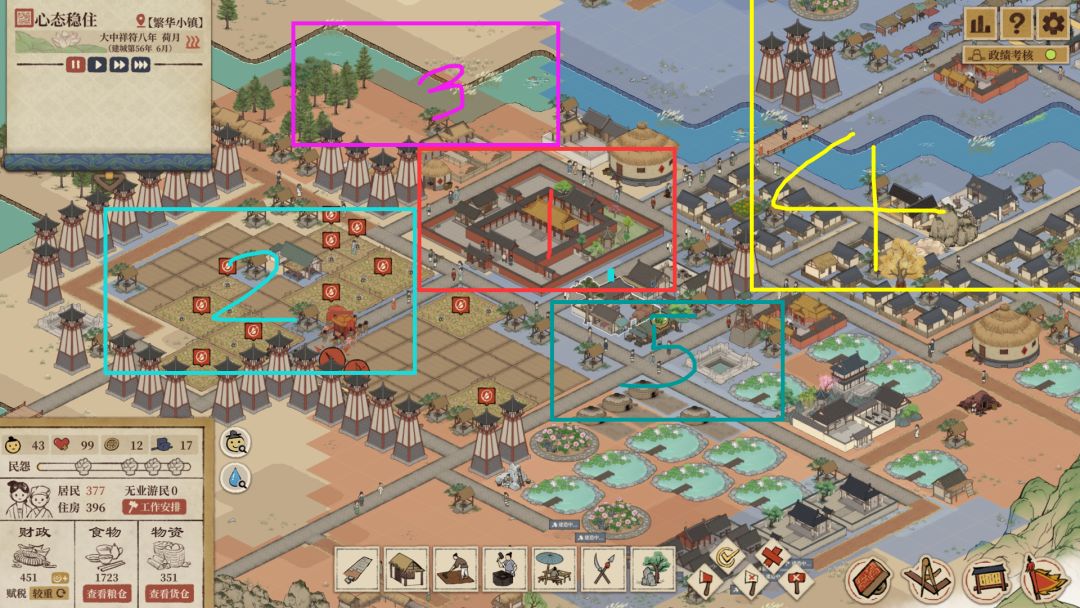 举个例子如下图,1是县衙,2是肥沃土地预设做农业区,4初期空间足做老居民区,后期可以过河(只需要建两个木桥)扩展空间,做新居民区,5脚店区(基本在农业和居民区之间),1245是初期就确定的,然后3空间小,前期建小粮仓小货仓,后期可以过河(只需要两个木桥)建大仓库;这样的话12345都基本确定了,其他的药铺、书院、募兵所等见缝插针、合理安排即可,另外后期2农田菜田一般不够,也要提前想好较近的有肥沃土地的地方修路搞新农业区