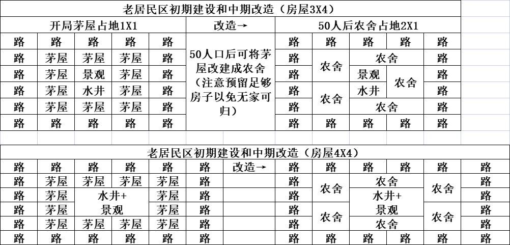 开局建房的时候可以同步在房附近修路、建水井,增加幸福度,大概一间房子40左右幸福度;房子建议偏正方形建造,前期(茅屋农舍)3X4或4X4,后期(瓦房宅院)6X6或6X7,举例如下